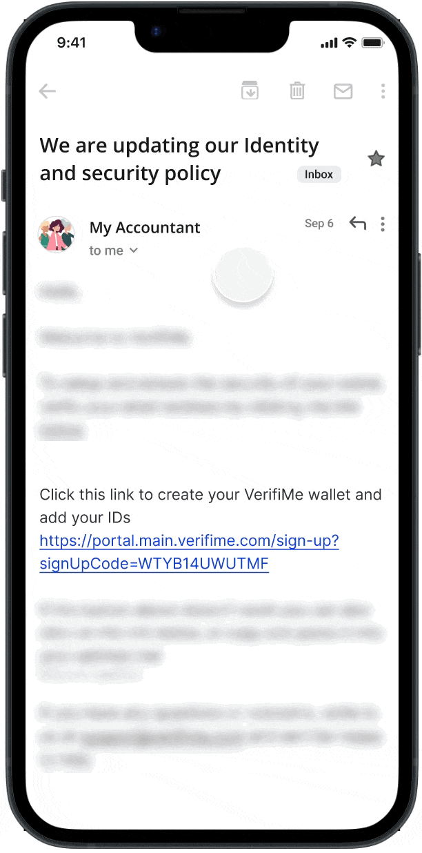 Step 1. In your inbox, locate the email which contains a QR code or URL to our platform, received from/on behalf of the company you currently/plan to do business with. Scan the QR code or click the link.