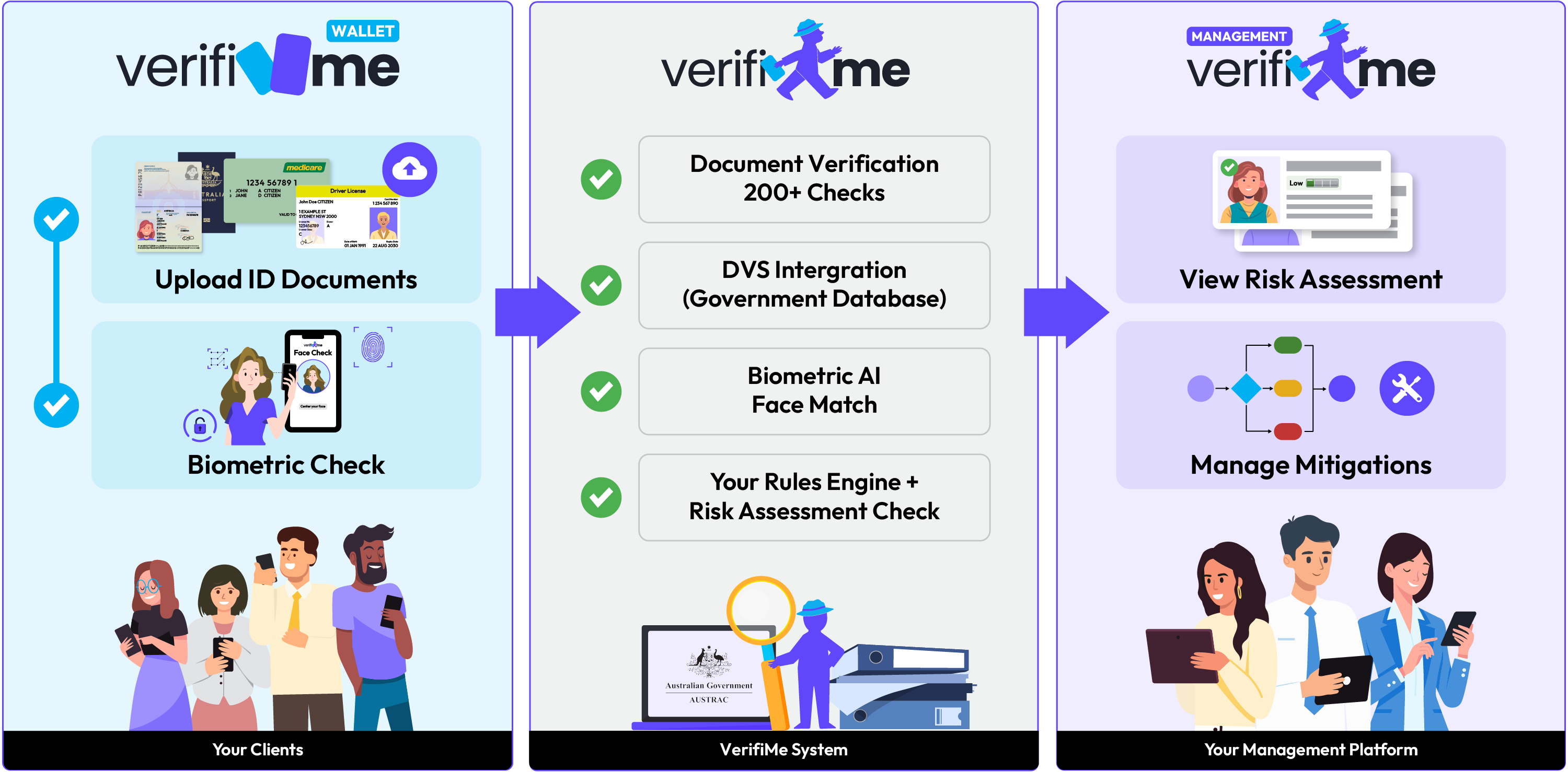 VerifiMe supports companies, trusts, partnerships, sole traders, and complex nested structures, automating beneficial ownership identification and verification for all controllers. With real-time ASIC integration, role-based requirements, PEP and sanctions screening, and a full audit trail, the platform simplifies complex verifications while ensuring transparency and accountability.